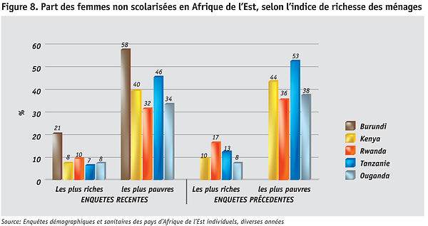 Inégalités riches/pauvres : Le prix ayant toujours été une barrière, il crée des inégalités partout dans le monde dans une infinité de domaines. D'un point de vu éducatif, les ménages riches sont bien plus privilégiés par rapport aux ménages pauvres (graphique ci dessous). L'accès à l'éducation est donc très inégal avec aucun moyen de financement par l'intermédiaire de prélèvements obligatoire qui assureraient une scolarité pour tous comme en France. « Les riches restent donc riches, et les pauvres restent pauvres ». Car la scolarité ouvre des portes pour des métiers d'avenir bien mieux payés que celui d'agriculteur. Bien que ce soit à nuancer dans certains cas particulier où les diplômes n'assure pas forcément une réussite professionnelle.